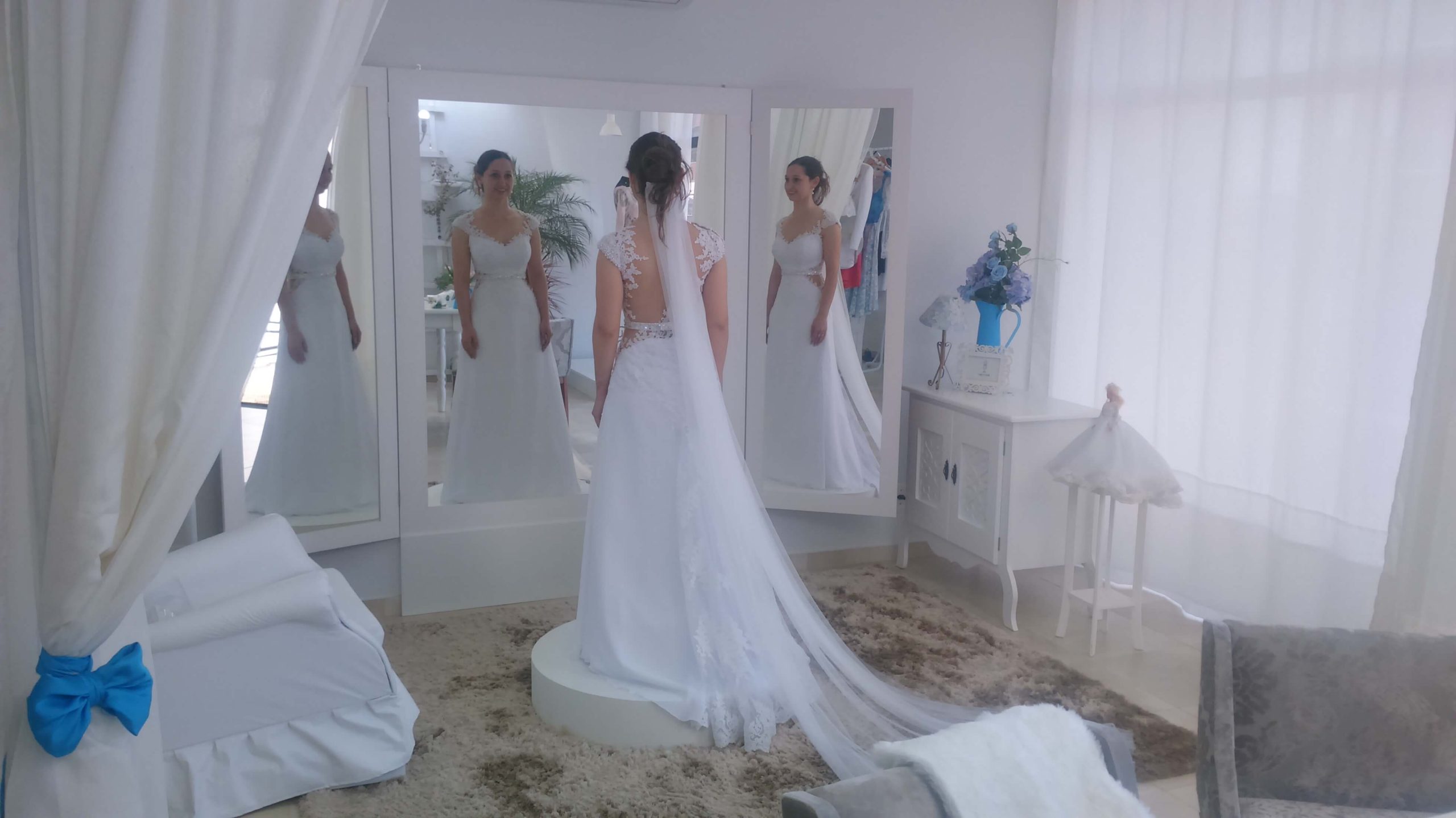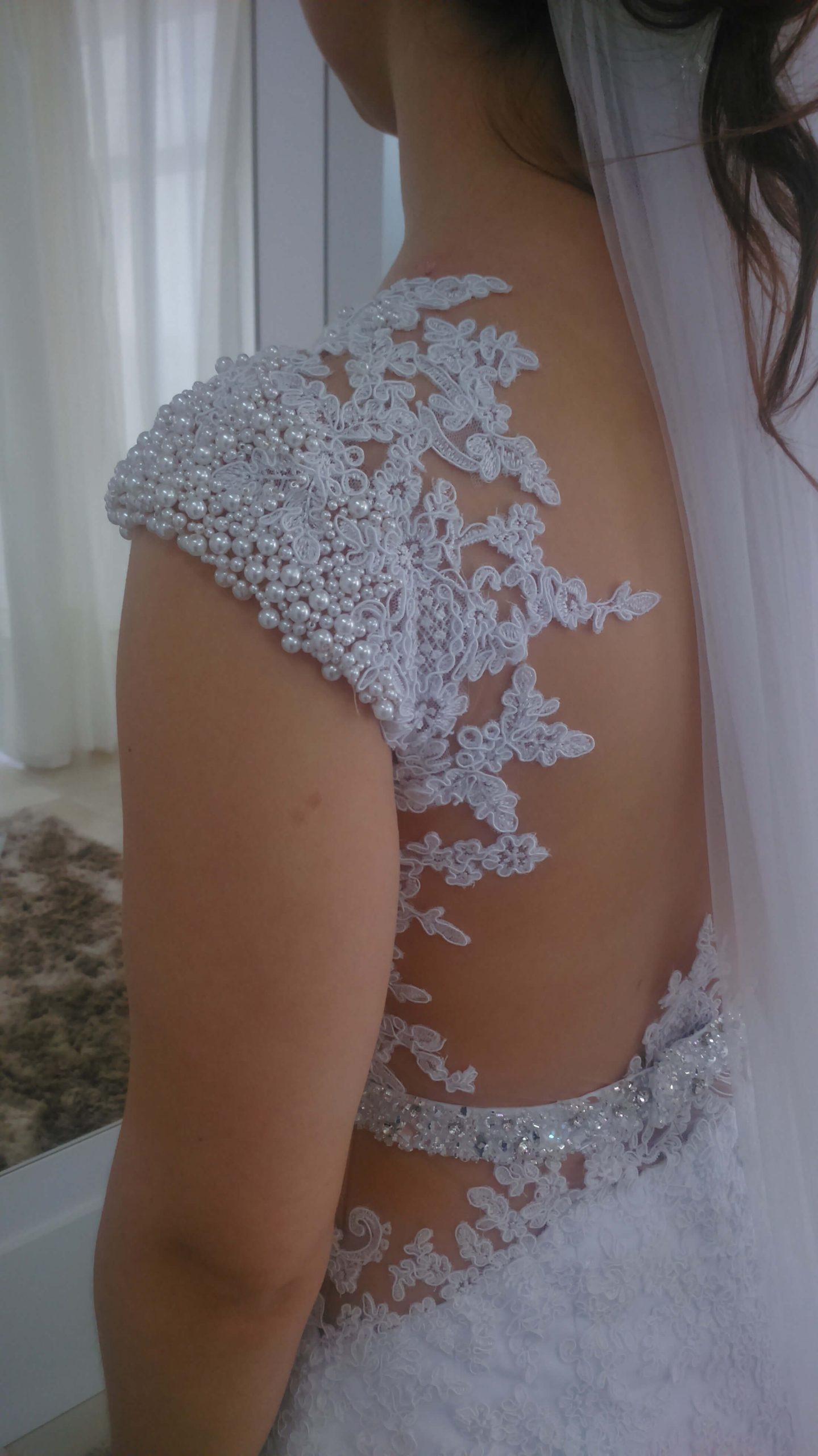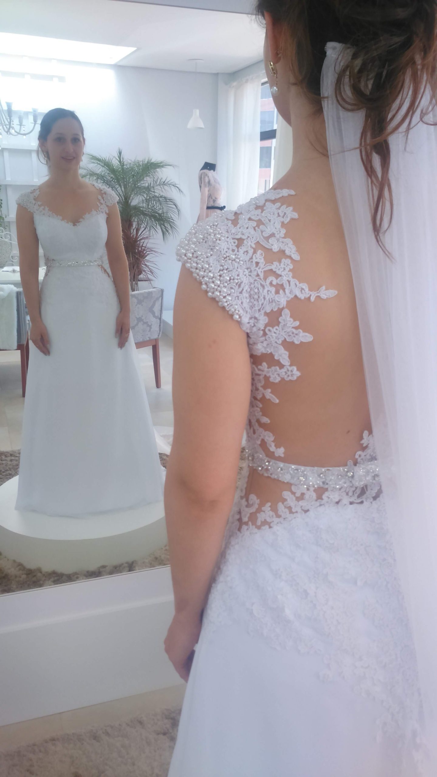 O desenvolvimento do vestido de Noiva da Jeh foi muito emocionante. Sempre que nos encontrávamos as emoções floresciam, ela estava sempre irradiante de alegria e cada prova ficava mais bonita ainda. Quanto ao modelo optamos pelo modelo semi sereia com recortes que valorizassem sua cintura e trouxessem uma silhueta alongada. Tivemos o cuidado para que todos os materiais utilizados fossem bem branquinhos, sendo a base em crepe pascale, sobreposição de musseline toque seda, e todo o corpo do vestido  bordado a mão com renda Soutache. Também, utilizamos do tule Ilusion para garantir leveza nos recortes e aplicação da renda nas costas. Outro toque delicado do vestido é a manguinha bordada em perolas que também se espalham aleatórias pelas rendas aplicadas no decote com destaque para o cinto bordado em pedrarias e cristais. Ufa! Mas ainda tem o toque final, o véu, que optamos por algo leve e prolongado! Como devem imaginar, ela estava irradiante e linda! Uma verdadeira Rainha para seu Príncipe Roger!