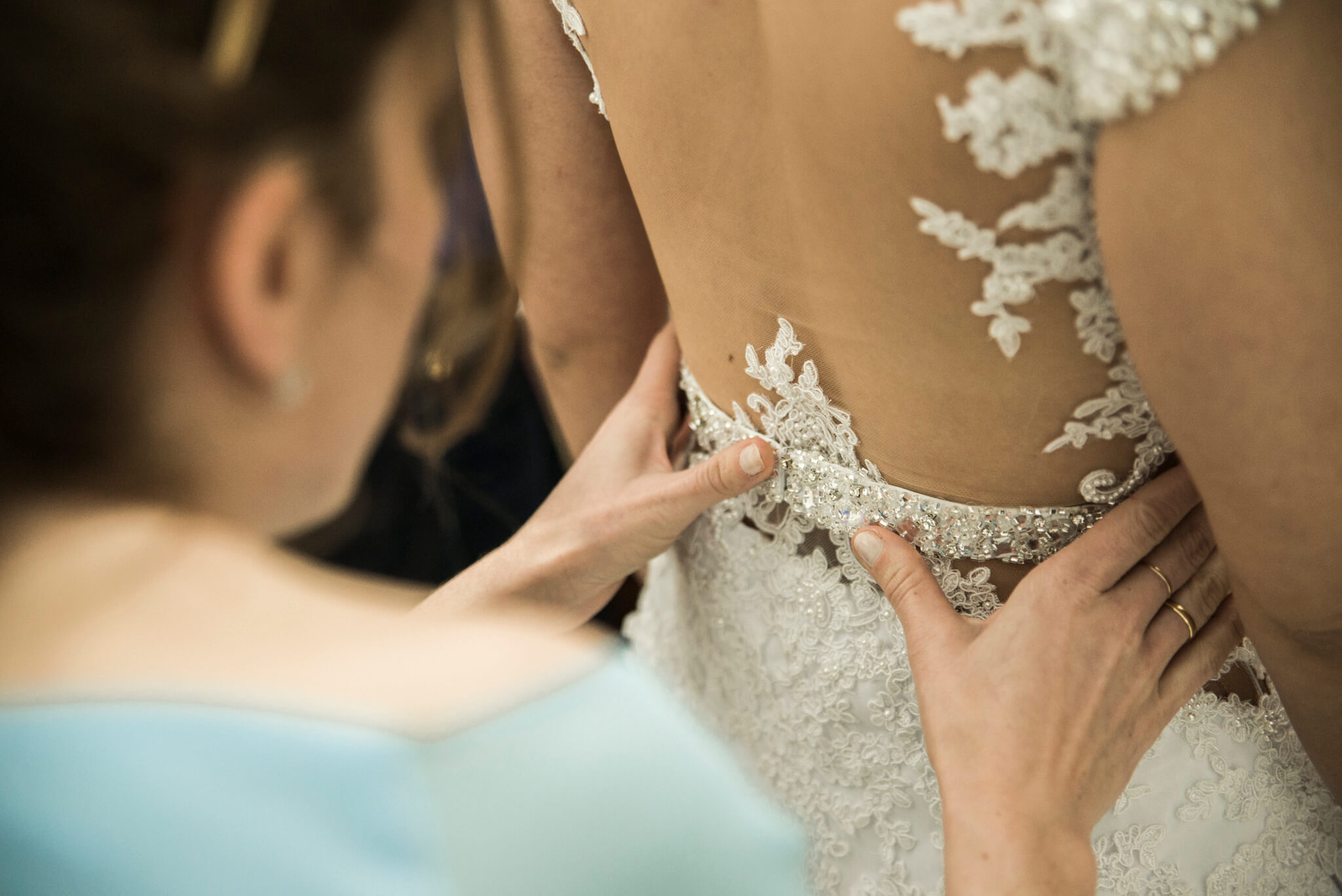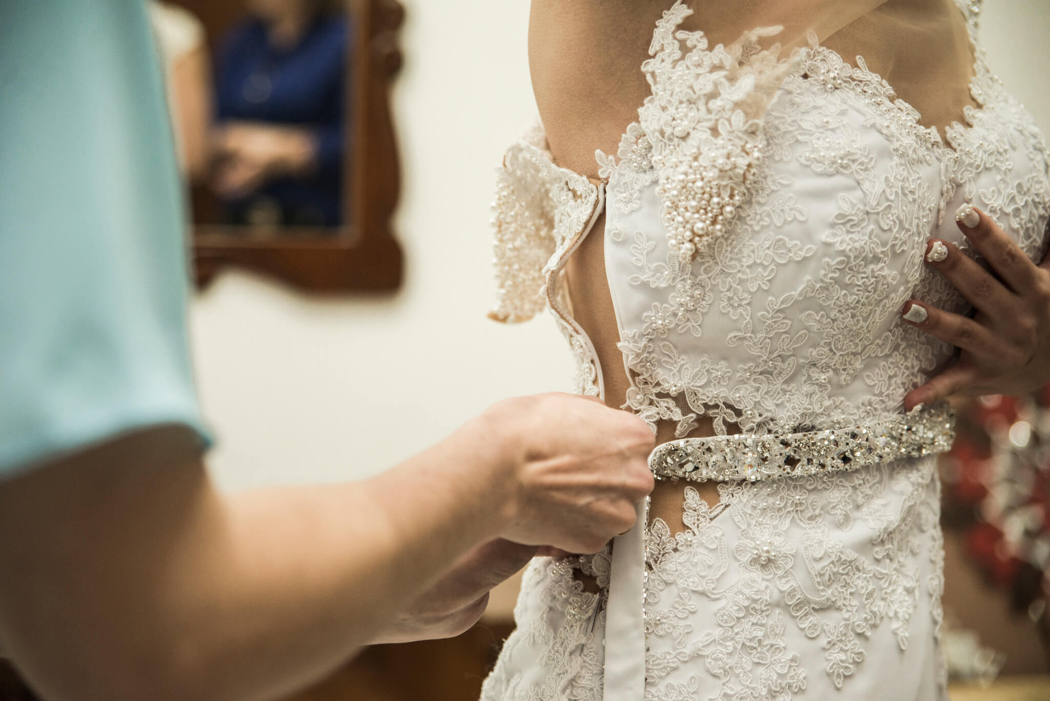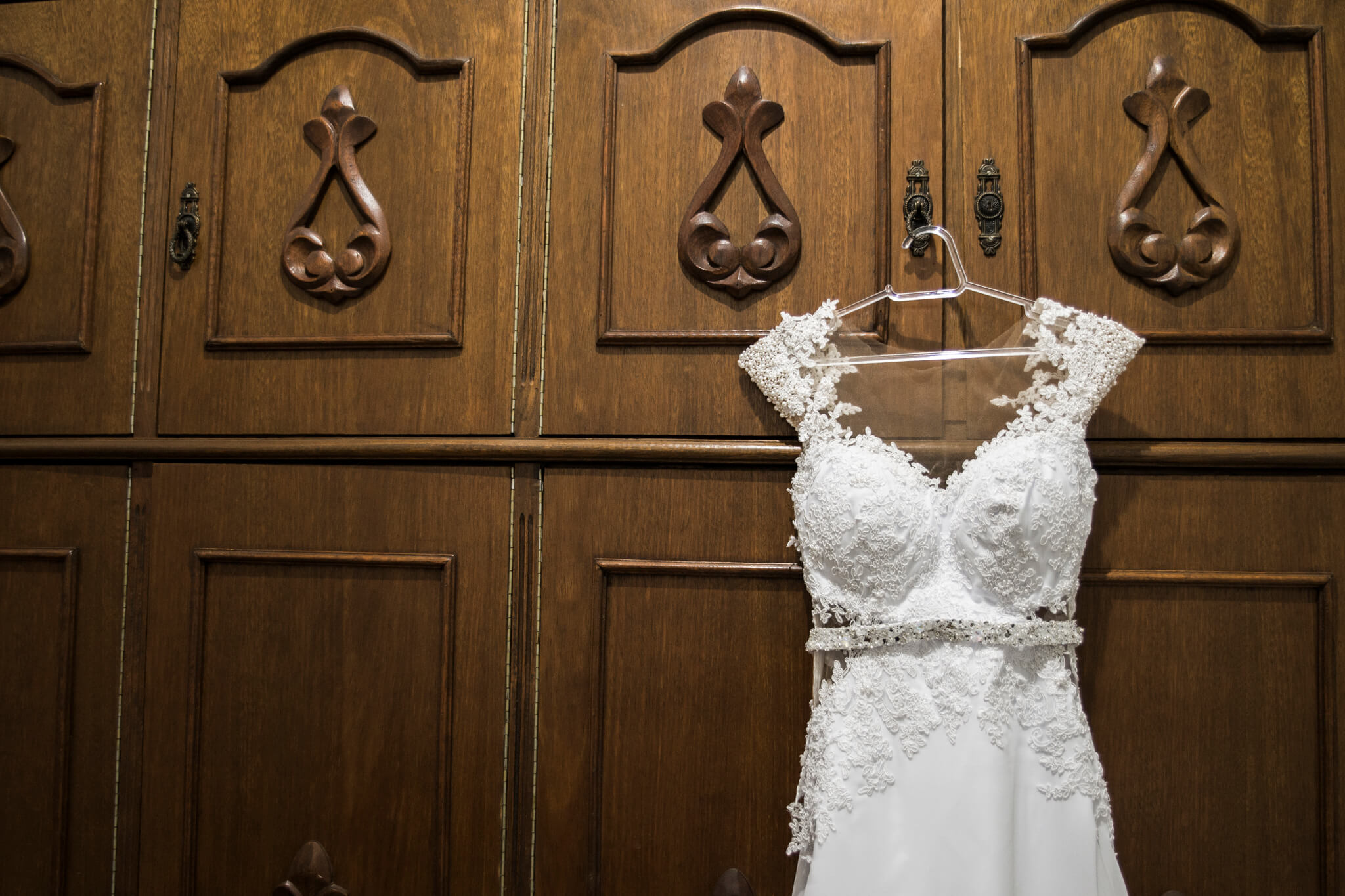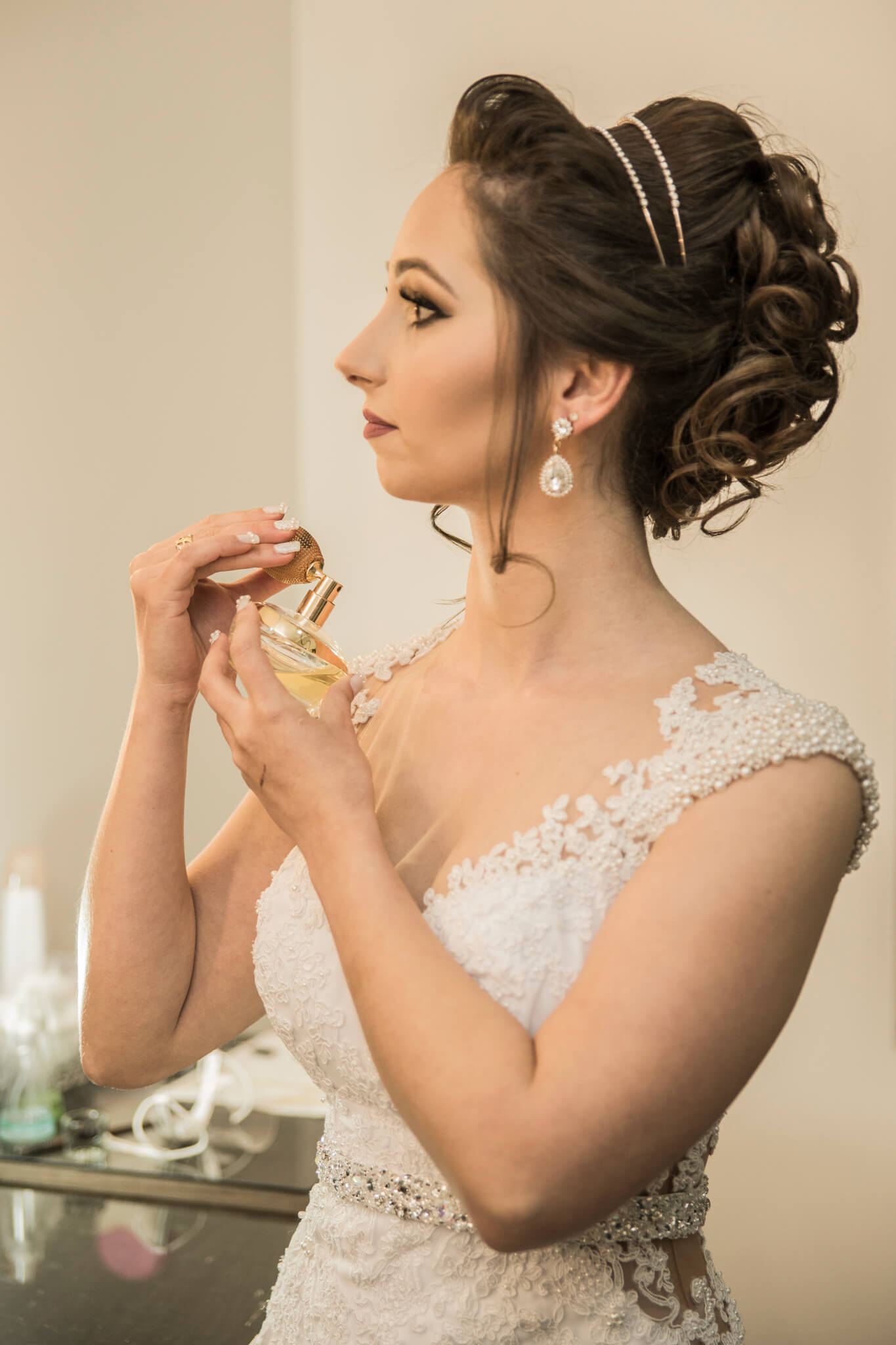 O desenvolvimento do vestido de Noiva da Jeh foi muito emocionante. Sempre que nos encontrávamos as emoções floresciam, ela estava sempre irradiante de alegria e cada prova ficava mais bonita ainda. Quanto ao modelo optamos pelo modelo semi sereia com recortes que valorizassem sua cintura e trouxessem uma silhueta alongada. Tivemos o cuidado para que todos os materiais utilizados fossem bem branquinhos, sendo a base em crepe pascale, sobreposição de musseline toque seda, e todo o corpo do vestido  bordado a mão com renda Soutache. Também, utilizamos do tule Ilusion para garantir leveza nos recortes e aplicação da renda nas costas. Outro toque delicado do vestido é a manguinha bordada em perolas que também se espalham aleatórias pelas rendas aplicadas no decote com destaque para o cinto bordado em pedrarias e cristais. Ufa! Mas ainda tem o toque final, o véu, que optamos por algo leve e prolongado! Como devem imaginar, ela estava irradiante e linda! Uma verdadeira Rainha para seu Príncipe Roger!